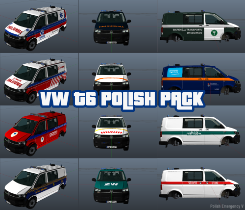 Modyfikacja VW T6 Polish Pack to pierwszy zestaw 64 oznakowań polskich służb do pojazdu VW T6 wykonana przeze mnie. Zawartość: Plik Readme (w języku polskim, angielskim i białoruskim) Dwa foldery z teksturami UWAGA: Modyfikacja NIE ZAWIERA tekstur sygnałów ani belki, a jedynie tekstury karoserii Jest to bardzo wczesna i prymitywna wersja modyfikacji, dlatego wszelkie błędy, uwagi i propozycję proszę niezwłocznie kierować do mnie w wiadomości prywatnej, lub w komentarzach- 3 comments
